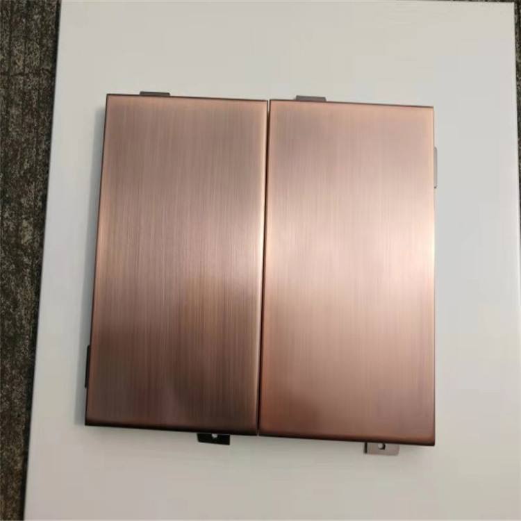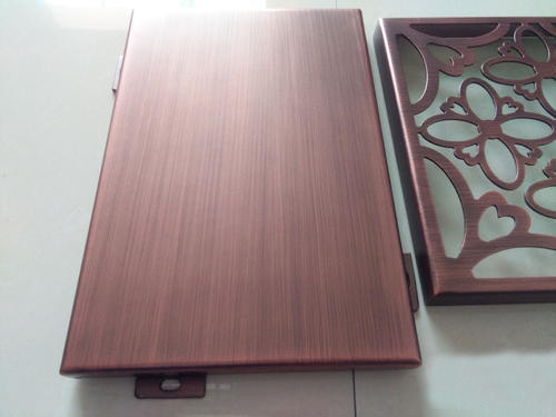 鍍銅拉絲鋁單板采用優(yōu)質(zhì)高強(qiáng)度合金鋁板,用“三涂二烤”工藝在鋁板上依次噴涂底漆、面漆、顏色漆及透明清漆,并在烘干固化后的仿銅氟碳漆表面進(jìn)行拉絲工藝處理,氟碳漆仿銅產(chǎn)品圖案具有銅的實物感、立體感,效果逼真,紋理清晰,圖紋牢固耐磨。減少采用銅板裝飾的高額成本,節(jié)約資源,提高經(jīng)濟(jì)效益。
